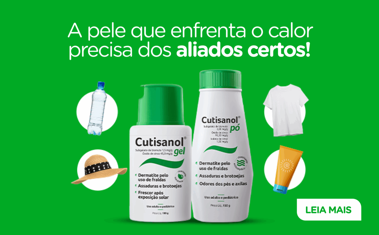 CUTISANOL® GEL E CUTISANOL® PÓ SÃO MEDICAMENTOS. SEU USO PODE TRAZER RISCOS. PROCURE O MÉDICO E O FARMACÊUTICO. LEIA A BULA. SE PERSISTIREM OS SINTOMAS, O MÉDICO DEVERÁ SER CONSULTADO. Cutisanol® Gel – Subgalato de bismuto + Óxido de zinco – 100G. USO TÓPICO. USO ADULTO E PEDIÁTRICO. Indicações: prevenir e combater as dermatites causadas pelo uso de fraldas, eritemas provocados por assaduras e brotoejas. Ação emoliente, umectante e hidratante. Protege a pele contra o vento e alívio após exposição prolongada ao Sol. Reg MS.: 1.0298.0600.001-9. Cutisanol® Pó – Subgalato de bismuto + Óxido de zinco + Iodeto de timol – 150G. USO TÓPICO. USO ADULTO E PEDIÁTRICO. Indicações: Prevenção e combate de dermatites causadas pelo uso de fraldas, eritemas provocados por assaduras e brotoejas. Secativo, previne e trata odores nos pés e axilas. Reg MS.: 1.0298.0600.002-7. Cristália – Produtos Químicos e Farmacêuticos Ltda. Rod. Itapira – Lindóia, Km 14 – Itapira – SP. Referências: 1. Cutisanol® Gel (Subgalato de bismuto + Óxido de zinco) Bula do medicamento. 2.Cutisanol® Pó (Subgalato de bismuto + Óxido de zinco + Iodeto de Timol) Bula do medicamento. Produção do material: Outubro/2025 .